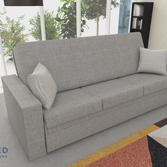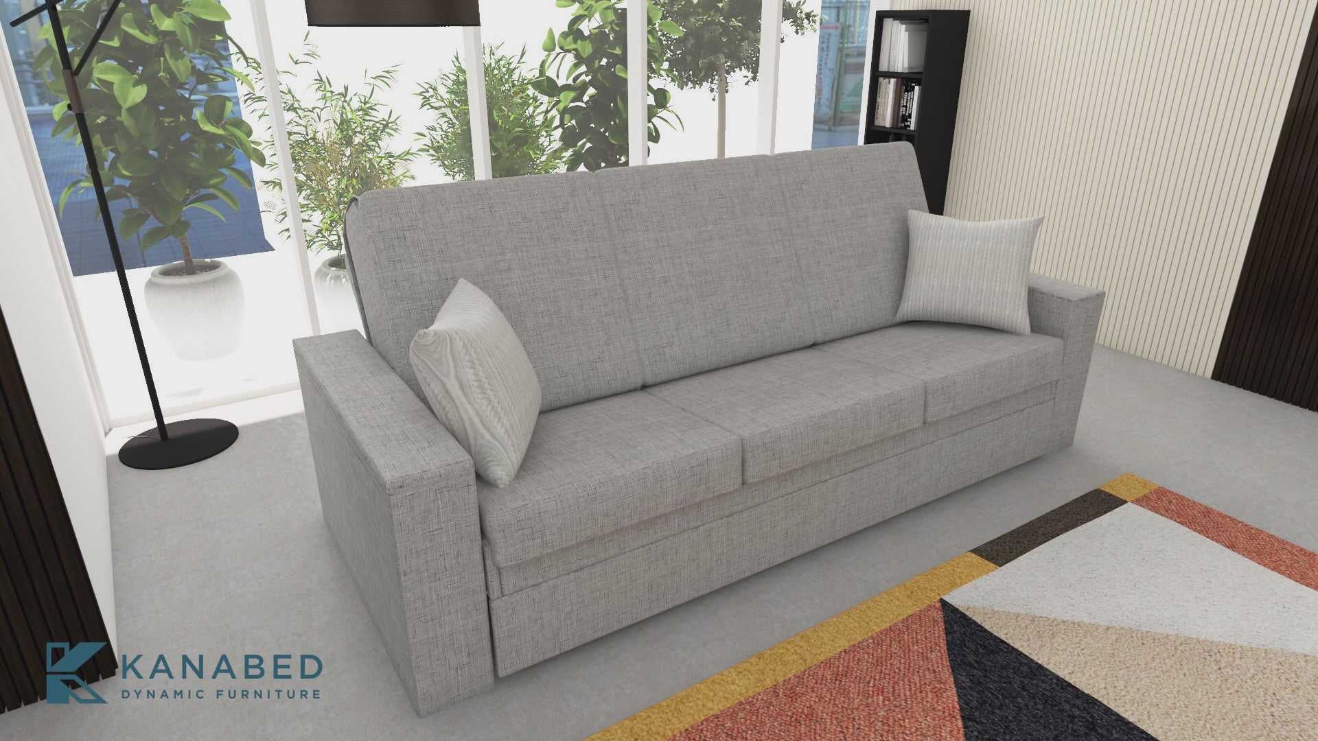 Meet Kanabed, the game-changing dual-purpose furniture that excels as both sofa and bed without sacrifice. Relax on a genuinely comfortable sofa, then effortlessly convert it to a perfect-height Twin/Twin XL bed with our exclusive US Patented steel alloy mechanism. Practical armrests double as storage compartments for bedding and serve as a headboard with their reliable ratchet system. The full back cover elegantly conceals the mattress, making Kanabed a sophisticated addition to any room, regardless of placement. Transform your living space with one simple motion—pull to reveal your bed, lift to restore your sofa. Experience true versatility without compromise!